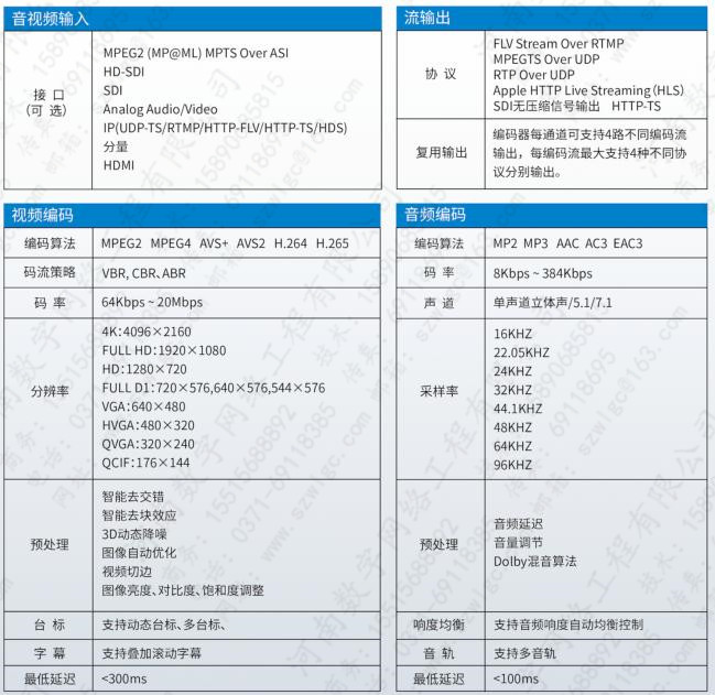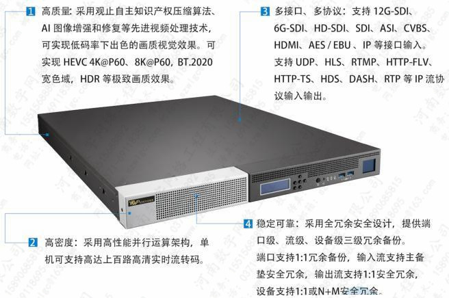 | 支持100路標清或25路高標清節(jié)目編轉(zhuǎn)碼;支持HEVC4K@P60、8K@P60,BT.2020寬色域HDR等較好畫質(zhì)效果,支持H.264/H.265/AVS+/DRA /MPEG2/4編轉(zhuǎn)碼,支持12G-SDI, 6GSDI,HD-SDI\SDI,ASI, CVBS,HDMS, AES/EBU,IP等輸入,支持UPD,HLS,RTMP, HTT P-FLV/TS,HDS, DASH,RTP等輸出.,碼率300k-100M |