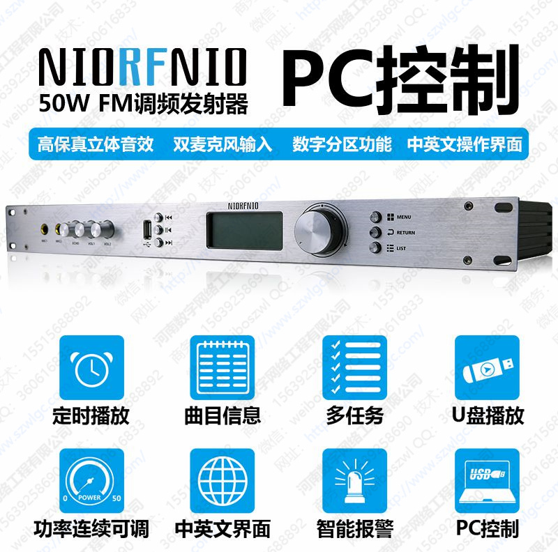 DNE-2550是一款改進型、結構堅固、穩定、操作簡單、音質產品,其主要特征如下: ●手機遙控開、關機等 ●自帶U盤播放 ●單/雙聲道模式可選; ●定時任務播放; ●可單獨設置任務工作頻率; ●斷電短信報警 ●散熱優良,風噪小 ●發射功率從0W到50W連續可調; ●駐波保護功能,當天線未接好或匹配不好,自動進入保護狀態; ●溫度保護功能,當機器溫度過高時,自動進入保護狀態。