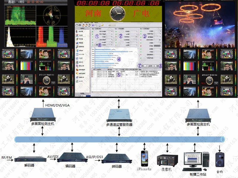 多畫面監(jiān)測設備支持的視頻格式有AVS/AVS+/MPEG2/H.264、支持音頻格式有MP3、AAC、AC3監(jiān)測內(nèi)容包括:圖像靜幀、黑場、彩條、音頻丟失、音量過低、音量過高、視頻丟失、數(shù)據(jù)中斷、解碼異常等,監(jiān)測指標準確,誤報、漏報率很低。
