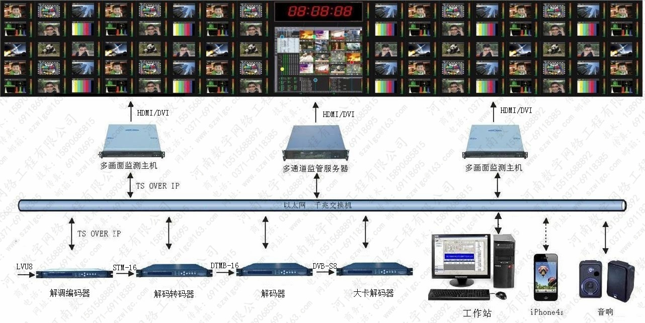 監(jiān)測前端設備輸出的TS OVER IP的單播/組播流進入多畫面監(jiān)測設備,多畫面監(jiān)測設備對輸入的碼流進行實時解碼并輸出到大屏上進行顯示。