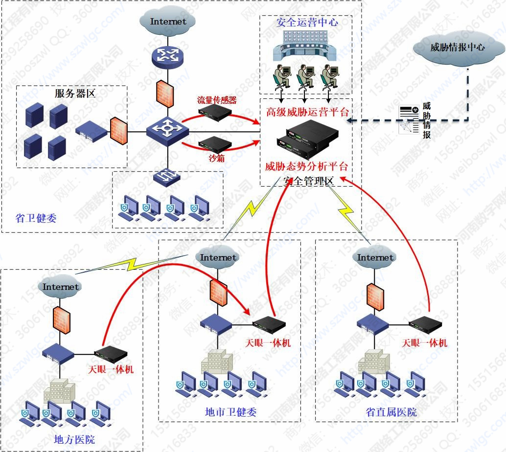 醫療行業已成為發生數據泄露多的行業,未經授權的泄密成為醫療行業數據安全的風險。在國內近75%醫療衛生機構的內網中存在安全威脅問題,內部勒索、病毒、惡意軟件頻現,各種威脅漏洞、APT攻擊等問題層出不窮,非法獲取病人信息已經形成產業化的趨勢,利用特種木馬、0day漏洞、水坑攻擊、釣魚攻擊甚至威脅更大的APT攻擊,已是傳統防火墻、IDS、殺毒軟件等安全防護設備無法發現和阻止。 衛生健康委員會作為行業網絡安全監管單位,在現有的技術和數據條件下也很難第一時間掌握我省醫院的網絡安全威脅形勢和可持續威脅的攻擊情況,同時基于國家對網絡與信息系統網絡安全等級保護的要求,需要做針對性的完善,因此為了應對各方面的需求,我們規劃建設省衛生行業威脅感知分析系統項目,建立對可持續威脅發現的技術措施和能力體系,提升我省醫療衛生行業網絡安全威脅發現的能力,進一步完善衛生行業的信息化建設和網絡安全保障能力。建立并督促落實統一的網絡安全運營中心,提升醫療衛生行業的風險管控能力,利用基于威脅感知分析系統和威脅情報來提升未知威脅的發現能力,協助醫療衛生行業從被動防御階段向主動防御階段轉變。